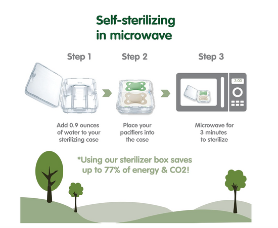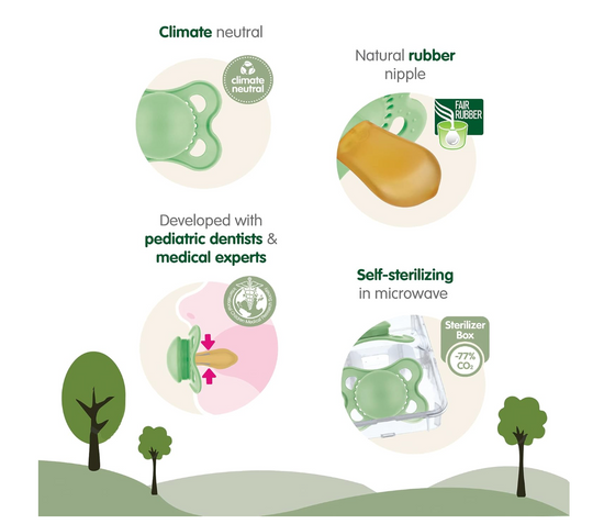 chupón, hecho de goma natural Climate Neutral MAM con materias primas sostenibles y biorrenovables, estuche esterilizador, pack de 2 unidades